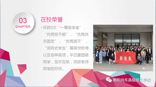 三载立志求学路,一朝鲲鹏展翼飞。为进一步做好学生发展指导工作,加强学生对升学的理解,帮助学生圆梦大学。通过优秀升学生的学习、生活事迹影响在校学生,激励他们养成良好的学习、生活习惯,共圆“成人+成绩=成功”的梦想,5月4日,朝阳向东高级技工学校——优秀升学生回校宣讲”活动如期举行。