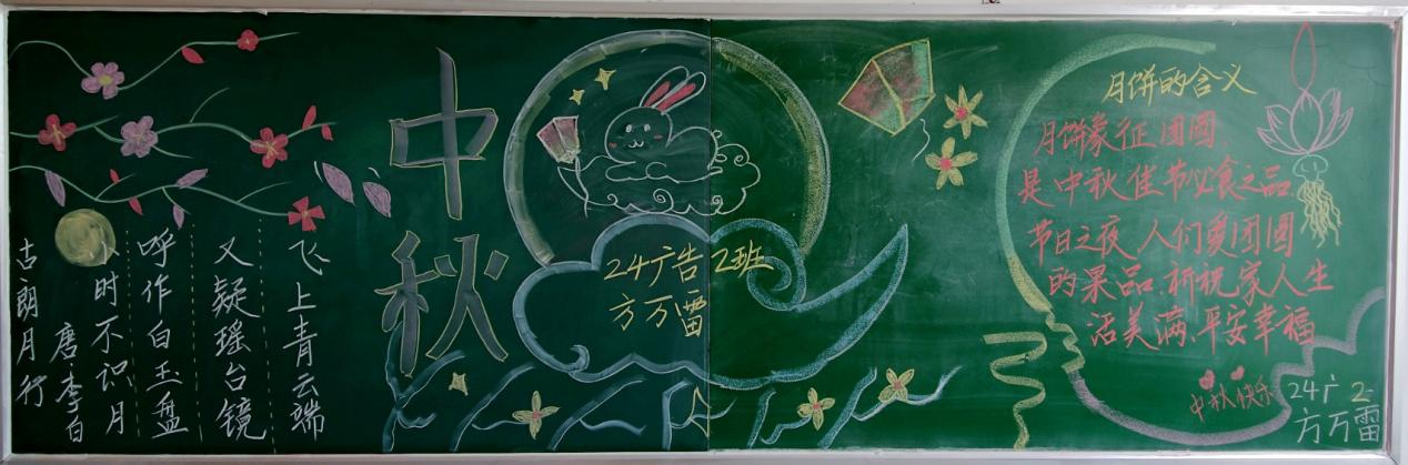 “约绘金秋,共画美好”绘制中秋主题活动的黑板报。每个班集体都集思广益、群策群力设计和绘制,版面多样、创意连连,作品中饱含着同学们对中秋佳节的美好祝愿。一面面内容新颖的黑板报,突出了我国的传统节日文化,也彰显了朝阳向东高级技工学校“传统文化为本,品德教育为先”的管理特色。
